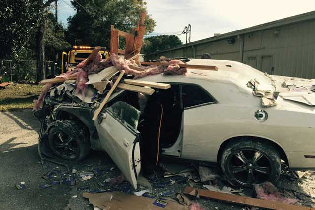 Wear-TV published a photograph from the scene depicting the attempted time travel on the Dodge Challenger where the white sedan was shown covered with debris from the offices. Employees have been notified not to enter the premises until a safety evaluation is carried out.